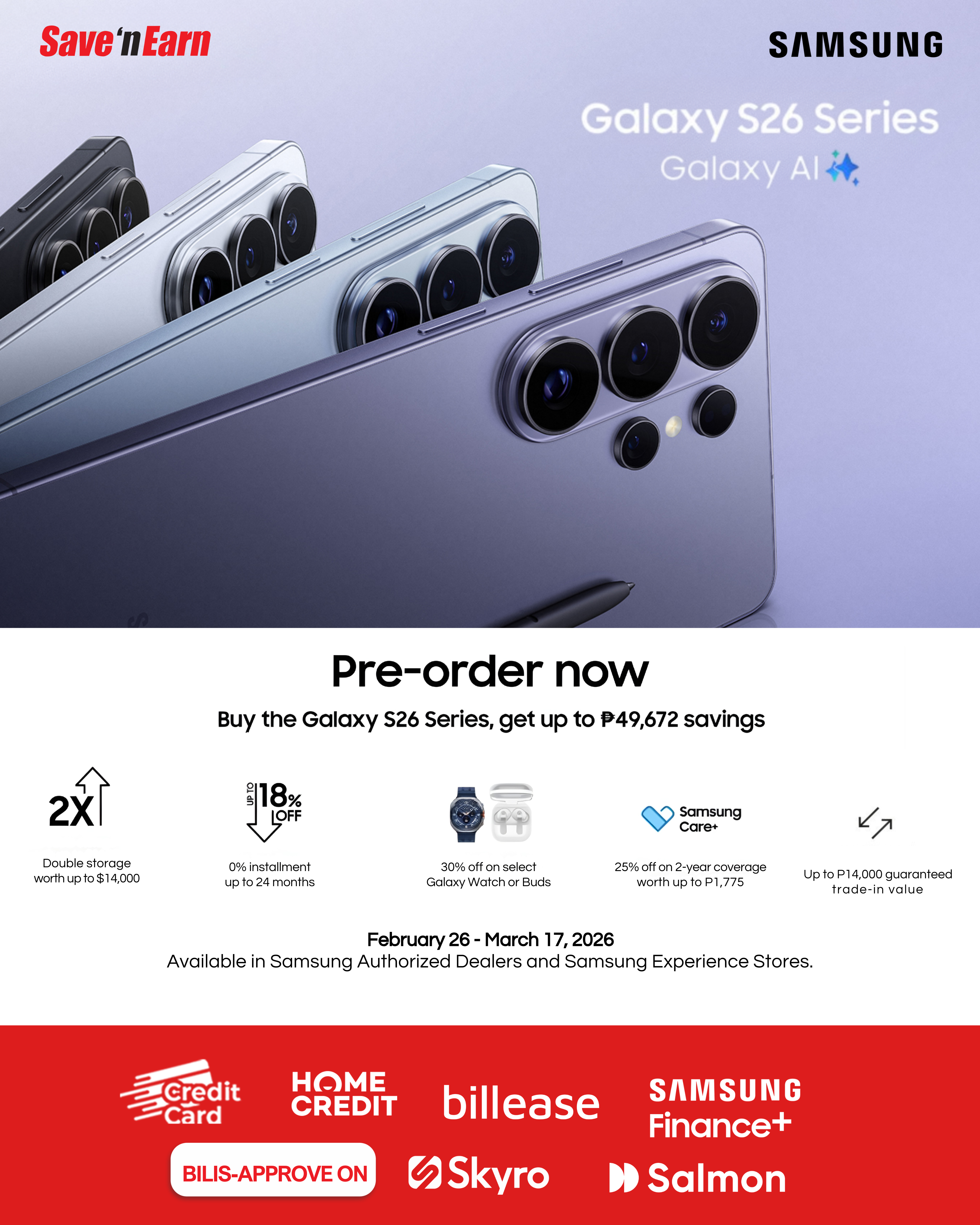 - Customer pre-orders the Galaxy S26 Ultra, S26+ or S26 from authorized Samsung dealers and Samsung Experience Stores from February 26 to March 17, 2026 by paying the P3,000 downpayment. A. Downpayment can be paid in store via Cash, straight payment via credit card, or with the Samsung Reservation+ voucher.B. If customer orders through savenearn.com.ph, Online Staffs must coordinate with SES BQ/ICM/ALTURAS to process the PRE-ORDER of their customer made on the website.